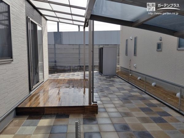 砂利を敷かれていたお庭でしたが、4色の平板をランダムに配置したインターロッキングテラスのお庭にリフォームしました。角や凹凸もなく水はけのよいお庭は、お子様を遊ばせても安心です。掃き出し窓の前には家事に役立つテラス屋根や、段差を解消するタイルデッキを設置。室外ながら、お部屋のような温かみのあるデザインのお庭が完成しました。