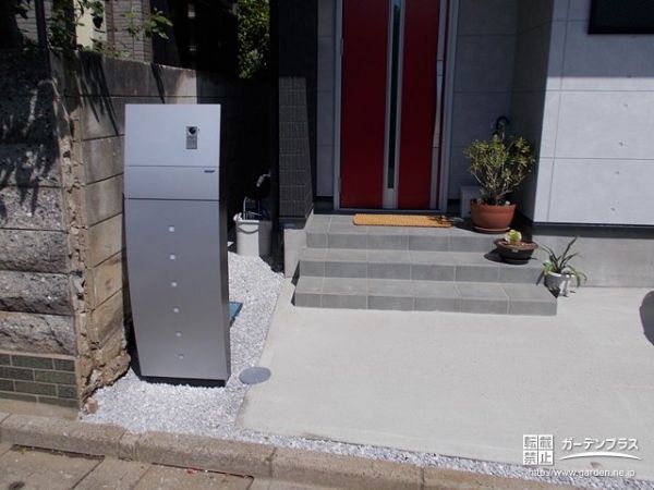 新築のお住まいの外構工事をご依頼いただきました。道路の角に接する敷地でしたが、勝手口側の道路境界は境界フェンスを設けて安全対策を施し、玄関側は広く土間コンクリートを打設した余裕ある駐車スペースに。スタイリッシュなアールデザインを取り入れた機能門柱を設置し、モダンなお住まいを引き立てます。