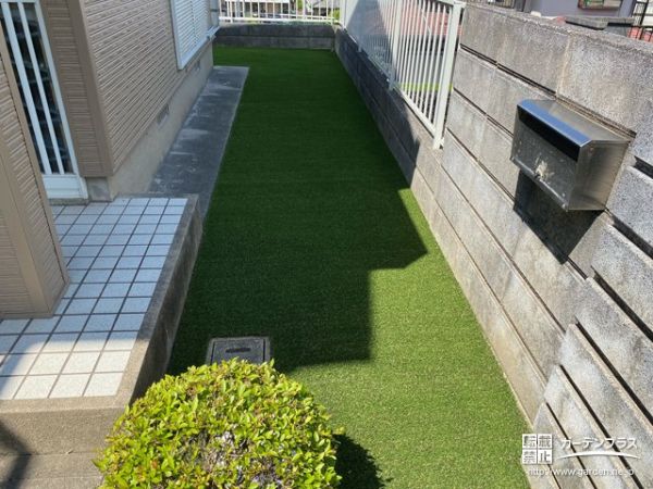 建物まわり・犬走り:防草シート + 人工芝 メモリーターフ