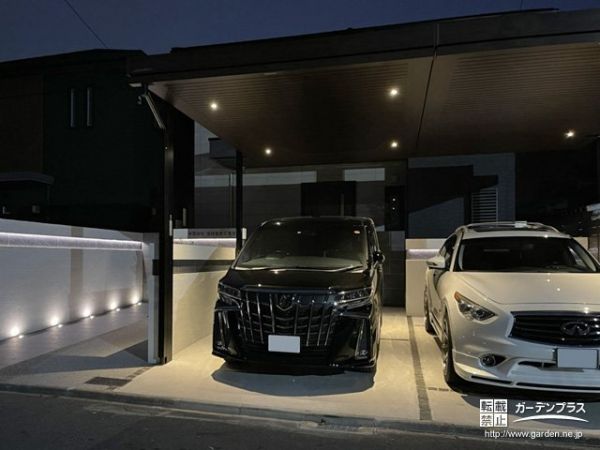 新築外構の二期工事として駐車スペースを施工させていただきました。土間コンクリートを打設し、黒いピンコロ石の目地を施工。スタイリッシュなデザインの車止めも2台分設置しました。目を引く大きなカーポートは梁から屋根を吊下げる構造美が魅力の「Uスタイル アゼスト」。天井材を入れることで、屋根に溜まる汚れやダウンライトの配線を隠すことができます。ライトアップで夜間もスタイリッシュな外構を楽しめる駐車スペースとなりました。