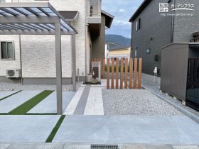 新築のお住まいの外構工事をご依頼いただきました。駐車スペースには多雪対応型のカーポートを施工。足元はコンクリートと人工芝を組み合わせて舗装し、ライトグレーと緑のコントラストが爽やかです。またインターロッキング平板を使ったアプローチはクランクさせ、角柱を組み合わせて、道路から丸見えにならないようにしました。お庭の人工芝は施主様がDIYで完成させるとのことで、ローメンテナンスながら鮮やかな緑を一年中楽しめるお庭になりそうです。