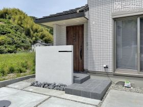 新築のお住まいの外構工事をご依頼いただきました。予算に合わせて、まずは土間コンクリートでの駐車スペース・アプローチの舗装をし、ファサードを整えました。建物周りは防草シートと砂利を使って雑草対策をしています。玄関前には目隠しとなる大きな塗り壁門柱を設け、ポーチ階段も拡張しました。モノトーンの洗練されたバランスで、シンプルな施工ながら玄関まわりに高級感を演出してくれます。