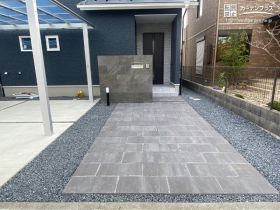 新築のお住まいの外構工事をご依頼いただきました。お庭の人工芝は施主様が担当して下さるとのことで、当店では仕上がりが美しくなるよう下地づくりを行い、お庭と室内を行き来しやすいようにウッドデッキを設置。また暮らしに便利な駐車スペースやカ-ポートも施工しました。アプローチや門柱には、天然石の風合いを感じられる舗装材やタイルを使って、落ち着いた雰囲気に仕上げています。すっきりとしたファサードと、のんびりできる緑のお庭とを楽しめる新築外王です。
