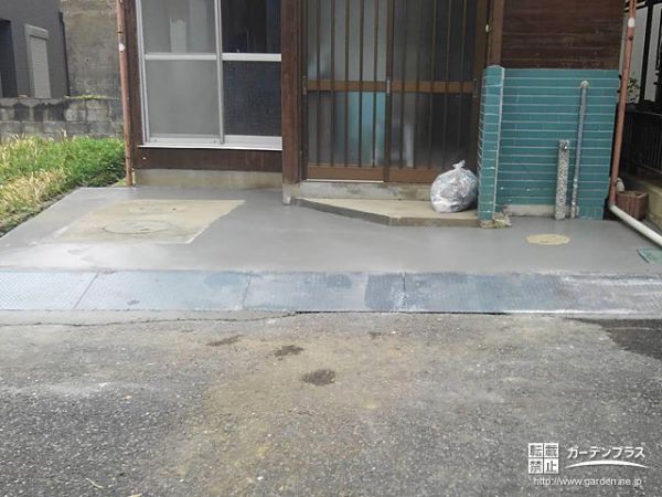 アプローチを転用し、駐車スペース設置工事を行いました。まずは、既存のアプローチを撤去して土の表面を鋤取り、土間コンクリートを打設。お車を駐車しやすいよう、玄関ポーチのコンクリートを斜めにカットし、立水栓も移設しました。既存スペースの面積を活用し、使いやすく仕上げたリフォーム工事です。