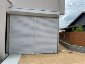 新築のお住まいの敷地外周に、目隠しフェンスを施工させていただきました。基礎として化粧ブロックを積み、高さと強度をプラスしています。フェンスはナチュラルな木目が美しいデザインですが、樹脂製なので腐食もなくメンテナンス要らず。横板の枚数や隙間の幅も調整できるので、敷地の3面をご希望の高さで囲うことができました。その他、既存のガレージにシャッターも設置しています。