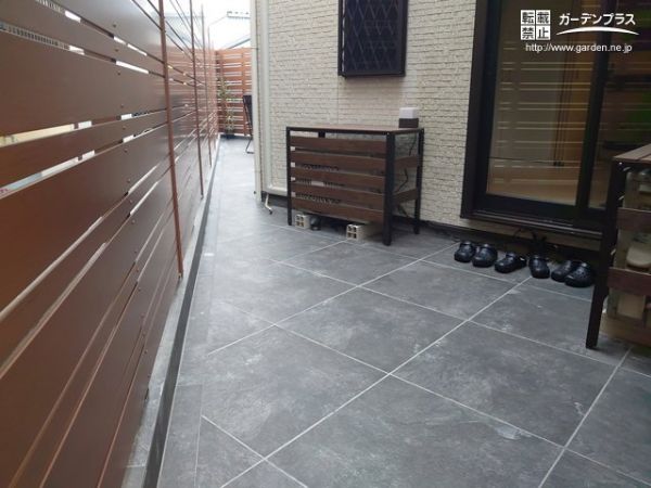 テラス囲い内タイルデッキ:下地コンクリートブロック + タイル貼
