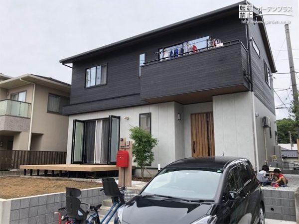 新築のお住まいの外構工事をご依頼いただきました。建物まわりと道路との間にやや高低差があるため、お庭や建物裏手にはしっかりした擁壁を施工されていましたが、駐車スペースにはまだ擁壁がなかったため、型枠ブロックで土留めを施工し、足元を舗装しました。建物はモノトーンのモダンなデザインでしたが、お庭には素敵なウッドデッキが施工されていたので、門まわりも乱形石やコンクリート製枕木を使ったナチュラルテイストに。可愛いデザインのボビポストがファサードのアクセントになった新築外構です。