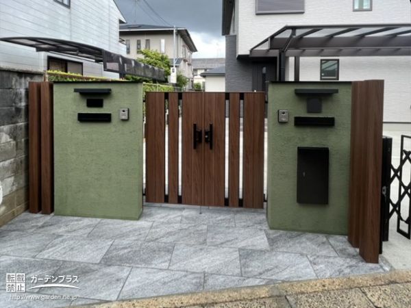 門柱:ブロックベース + コンクリートブロック + 四国化成パレットCX塗装仕上げ + 笠木 LIXIL デザイナーズパーツ 笠木 ブラック