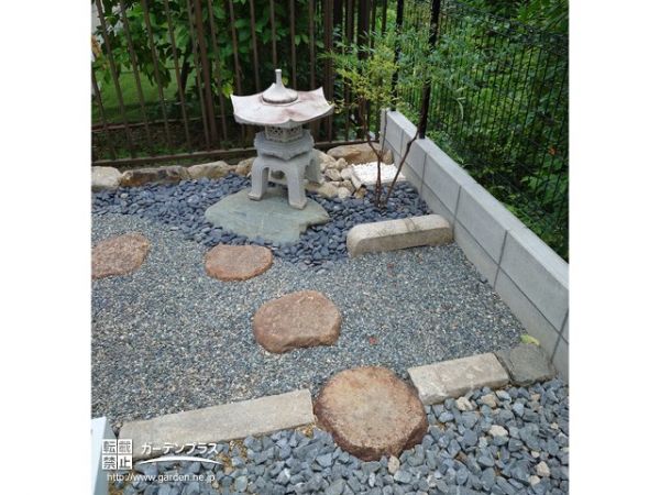 坪庭:沓脱石移設 + 石灯篭設置 + 化粧砂利敷設
