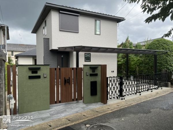 新築のお住まいの外構工事をご依頼いただきました。南北に長い敷地の中に2つのお住まいが建てられており、クローズ外構をご希望いただきました。まず門や駐車スペースは北側の接道部に1か所にまとめ、2台分の駐車スペースや2世帯用のポスト・表札を設置する門柱・門袖を施工。敷地内は奥のお住まいにも移動しやすいようコンクリート舗装したアプローチを設けています。それぞれのお住まいが生活しやすいよう、メンテナンス性や雑草対策にも配慮した新築外構です。