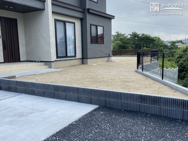 新築のお住まいの外構工事をご依頼いただきました。広い敷地ですが、変形地で高台に位置しているため、まずは敷地境界となる擁壁に沿ってブロックを積み、目隠しフェンスやメッシュフェンスを設置して安全対策をしました。また駐車スペースはファサードに必要な分だけ土間コンクリートを打設し、玄関までコンクリートを延ばしてアプローチを作成。機能門柱には宅配ボックスも組み込みました。広い外構ですが、コストを抑えながらもシンプルで使い勝手の良い設計です。