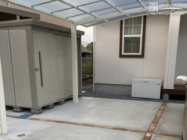 新築のお住まいの外構工事をご依頼いただきました。高台の開放的なお庭でしたが、小さなお子様がいらっしゃるとのことで、まずは擁壁の内側にメッシュフェンスを設置し、転落事故を防止。お子様がいると増える洗濯物も気軽に干せるように、掃き出し窓にはウッドデッキと物干し台を施工しました。二期工事にてファサード側に駐車スペース用のコンクリートを打設し、カーポートを設置。アール型の大きな屋根は間口が広く開放感があります。