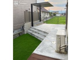 お庭のリフォーム工事をご依頼いただきました。当初のご要望はタイルデッキと人工芝のお庭でしたが、既存のウッドデッキともつながる広さにすると、タイルの費用がかなり嵩んでしまうため、モルタル仕上げのコンクリートデッキをご提案しました。その代わりに夏でも涼しい陰を作るテラス屋根や、ローメンテナンスでいつでも緑を楽しめる人工芝を施工することができ、お子様から大人まで快適なお庭空間に。日常だけでなく、ご友人を招いたガーデンパーティまで楽しんでいただける外構リフォーム工事です。