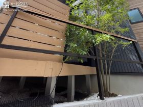 主庭全面にウッドデッキを施工しました。日向ぼっこやティータイムを楽しんだり、ご家族の憩いの場など様々にご活用いただけます。また安全性を高めるフェンスも設置。外からの視線もカット出来るのでプライベート空間を確保出来るようになりました。さらにデッキ下には雑草対策のため防草シートと砂利を敷設し、草むしりの負担が軽減されます。変形地のお庭が使いやすくなり、心地よい時間を過ごせる外構リフォーム工事です。