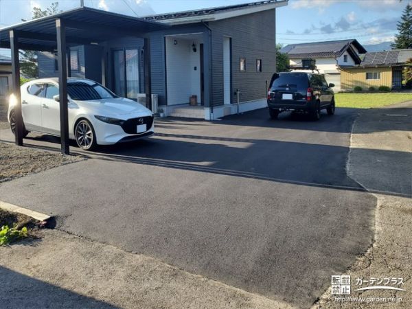 新築のお住まいの駐車スペースの外構工事を承りました。接道部からカーポート下の駐車スペース、アプローチ周辺までをフラットなアスファルトで舗装。アスファルトは、冷えると固まる性質を持つため、施工後数時間で使用可能になります。また、コンクリート舗装に比べて、鉄筋を仕込む作業も必要ないので、その分コストや時間がかかりません。お車の移動だけでなく歩行もしやすくご家族様が日々暮らしやすくなるよう設計した新築外構です。