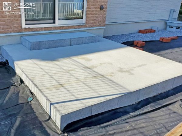 隣地境界線上に化粧ブロックを積み、お隣と共有の土留めと境界フェンスを設置しました。北側には土留めを施工し、南側には風通しが良く爽やかなホワイトカラーのメッシュフェンスを設置しています。敷地の境界が明確になることで、越境を気にせず過ごせるようになり、管理しやすくなりました。また主庭の掃き出し窓前にはタイルデッキの下地を施工し、完工後ご家族でタイルを貼ってDIYもお楽しみいただけます。