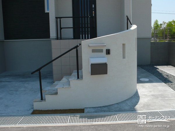 曲線を描いたアプローチ階段が高級感のある雰囲気を演出します。アプローチ塗壁の裏にはご家族皆様の手形を押しました。一生の記念になる外構に仕上がりました。