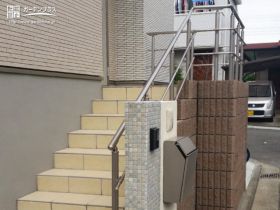 高さのある玄関アプローチに階段を設置しました。手すりを2段タイプのものにすることで、小さなお子様も安全に上り下りしていただけます。駐車・駐輪スペースにコンクリートピンコロ石で目地を施し、自然石の風合いで優しく落ち着いた印象となりました。
