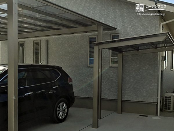 建物を美しく装飾するフレームはLIXILのGフレーム。人工芝とのコントラストが美しい印象を与えてくれます。奥にはテラス囲いを設置。あったかい日のあたるテラス囲いは、家族のくつろ議の場や、洗濯物干しなどの家事の場として大活躍します。シンプルでモダンな印象ながら、家族の住みやすさを考えたお庭デザインです。