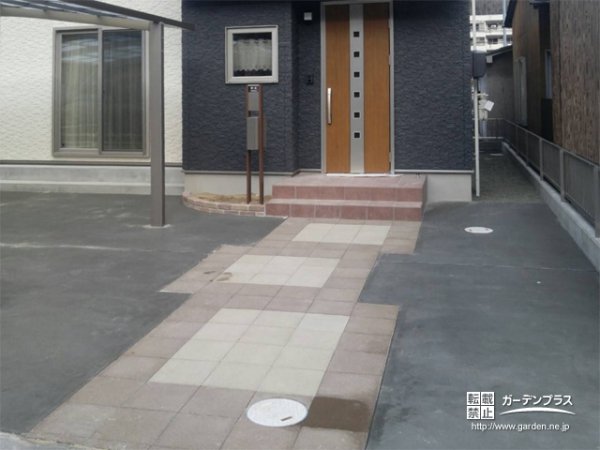 アプローチの足元を暖かみのある色合いのインターロッキングとワイドカーポートのラウンドの屋根がモダンなファザードに仕上げました。飛び石のように変化を付けたアプローチがお客様を美しくご自宅に誘います。