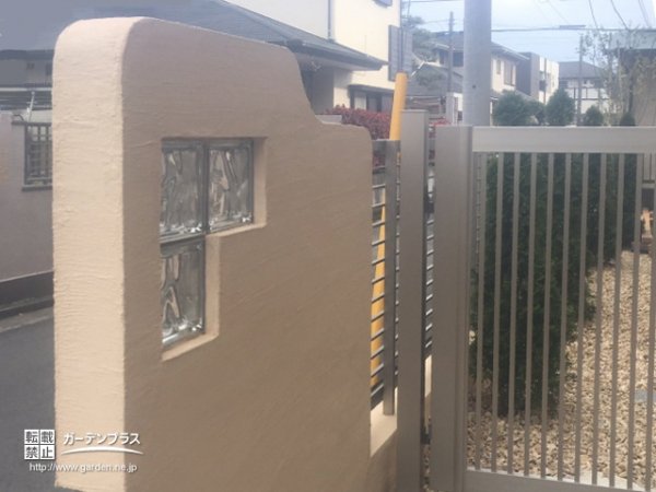 門袖: CB9段+下地モルタル+コテ仕上げ+オンリーワン ガラスブロック+オンリーワン クラウンストーン