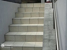 階段アプローチ: ブロック斜めカット + モルタル + 水性コンクリートカラー