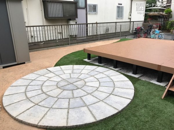 防草シートと砂利のお庭を、人工芝とたたきと花壇で、優しい曲線を描いた、ナチュラルテイストのお庭に仕上げました。凄すぎる雑草のお悩みも解決し、広々としたウッドデッキで癒しの時間が流れる、ガーデニングを楽しめる美しいお庭です。