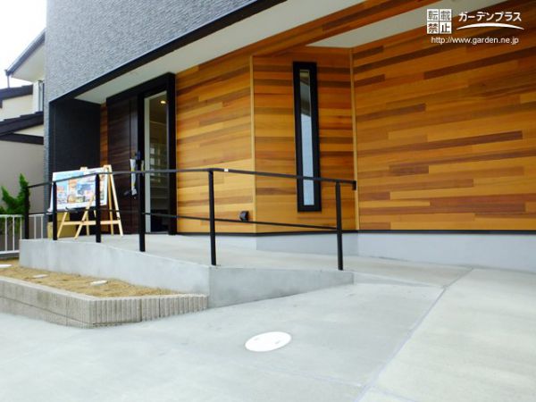 新築外構工事一式を承りました。駐車スペースを土間コンクリートにすることで、クールな印象の黒い外壁とのコントラストを際立たせつつ、壁面の木目が優しさをより一層引き立てます。建物の形状や色彩に合わせ、手すりや機能門柱をは黒の直線的なデザインを採用。スタイリッシュなイメージを強く押し出しました。一方で足元には芝生を植えて、温かみをプラス。モノトーンのデザイン性と芝生や木目の温かさ、スロープの機能性などが詰め込まれたオープン外構です。