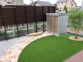 従来の主庭に、人工芝とタイルを敷設しました。半円の人工芝のカーブに合わせて、乱形石風のコンクリートタイルを敷き、温かみのあるデザインに。疑似目地が施されたタイルが、高級感を演出しています。シンボルツリーのシマトネリコがアクセントの、自然味溢れる優しい印象の主庭に仕上げました。