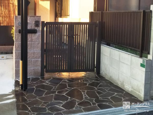 駐車スペース、門まわりのリフォーム、テラス屋根の設置などを承りました。駐車スペースは土間コンクリートを打設しカーポートを設置。黒フレームのカーポートが落ち着きのある雰囲気をまといます。アプローチには鉄平石の石張りに。重厚感と高級感をまとい格式高い門まわりを演出する仕上がりにいたしました。