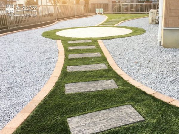 今回は新築外構工事一式を行いました。主庭の幾何学的なデザインが特徴的で、広い人工芝を敷いたお庭では小さなお子様やわんちゃんとふれあって遊んでいただくことができます。外周フェンスの設置によって、お子様やわんちゃんの飛び出しを防ぎます。