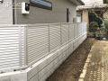 道路側の境界フェンスをメッシュフェンスから目隠しフェンスへ取り替えました。基礎部分はコンクリートブロックを使用し、強度面でも安心してご利用いただけます。スリット入りの落ち着いた木調フェンスはお住まいの外壁とも調和し、プライバシーを守りつつ優しい印象を与えてくれます。