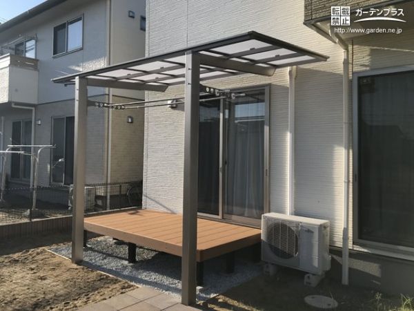 お洗濯が干しやすいウッドデッキとテラス屋根の設置工事