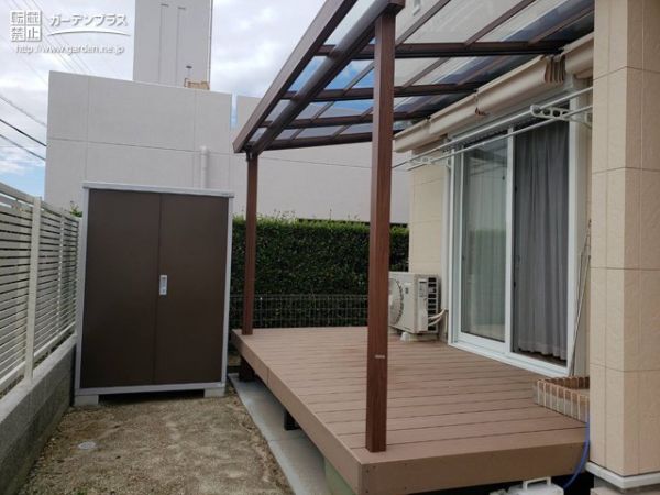 テラスにウッドデッキを設置したいとご依頼をいただきました。樹脂製で腐食のないウッドデッキに、パーゴラのような梁の構造がナチュラルな雰囲気のテラス屋根も合わせて施工。デッキ下は土間コンクリートを打って雑草対策もしています。ガーデニング用品が収納できるようサイズぴったりの物置や、お庭まわりに目隠しフェンスも設置しました。プライベートなお庭で、ひなたぼっこを楽しめるリフォーム工事です。