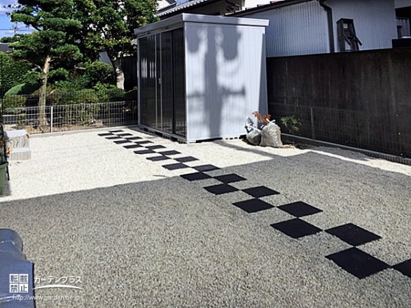 黒の平石と白砂利の市松模様が作る、和モダンなガーデンリフォーム工事