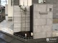 砂利や駐車スペースの土間コンクリートのみだった外構のリフォーム工事をご依頼いただきました。道路の角に面する玄関ポーチを囲うように門柱を施工。杉板RC擁壁を再現したモダンなタイルを貼って仕上げました。またアプローチは耐久性の高い土間コンクリートで舗装しつつも、端に乱形石を貼って彩りをプラス。機能とデザイン、上品さとモダンさをバランスよく取り入れたファサードとなりました。