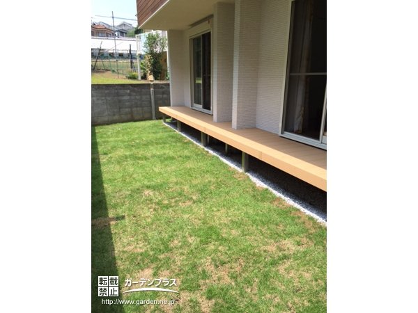 お庭全体を芝生に敷詰め、目に優しい緑色の明るいお庭を作りました。ウッドデッキ下には防草シートを敷き、雑草を防ぎます。