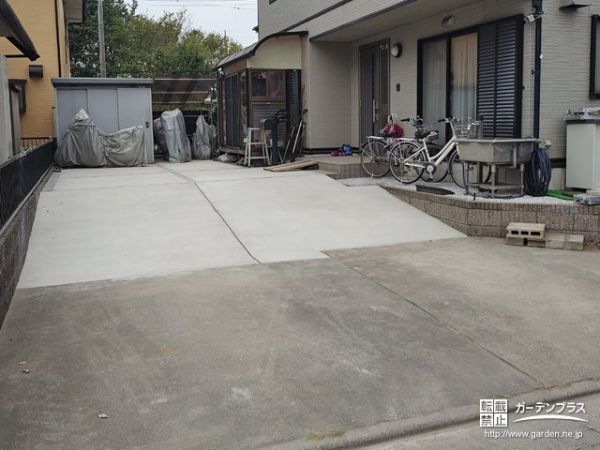 駐車スペースの拡張工事のご依頼を承りました。既存の植栽を撤去し、お車のタイヤの負担にならないよう土間コンクリートを打設しました。