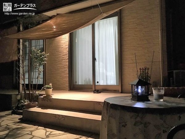 既存の植栽や石張りを撤去し、新たに木目の美しさをタイルで表現したいるテラスを設置した、植栽が華やかに自然の風を漂わせる美しいお庭のリフォームが完成しました。ライトアップされたお庭は、昼間とは違い、タイルや自然石の印影が魅力的な表情で、夜のお庭も楽しむことができます。