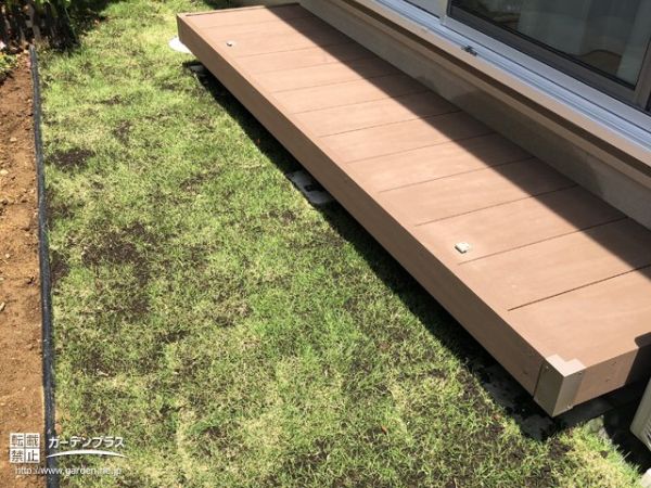 爽やかな芝生のお庭を眺められるウッドデッキ設置工事