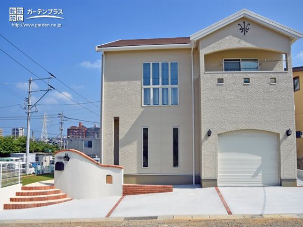 新築外構一式工事を承りました。駐車スペースの土間コンクリートの目地にはレンガを使い華やかさを演出。お住まいの印象を意識して、丸みのあるカーブや華やかなレンガを使ったかわいらしい南欧テイストの開放的なオープン外構に仕上げました。