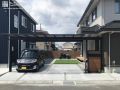 新築外構一式工事を承りました。駐車スペースは広々と2台分を確保し、カーポートを設置。梁を延長して柱を門柱裏にレイアウトして、歩行の際に邪魔にならないよう玄関への動線にも配慮しました。建物右手には駐輪スペースも完備。ブラックカラーと木目調のエクステリアでシックにまとめた、オープンスタイルの外構デザインです。