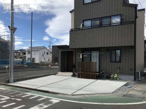 新築のお住まいの外構工事をご依頼いただきました。ファサードはお車を停めやすいよう全面土間コンクリートで舗装しましたが、玄関ポーチの前だけスリットを多めに入れて、アプローチとしてまわりと差別化したデザインに。玄関ポーチ脇に駐輪スペースも設けました。ウッドデッキを設置されていた主庭には人工芝を敷設し、背の高い目隠しフェンスを施工。木目調カラーや人工芝の緑が、お庭を明るく彩ります。