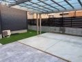 新築のお住まいの外構工事をご依頼いただきました。 玄関横の駐車スペースは2台分の土間コンクリートを打設し、モダンなフラット屋根のカーポートを設置。アプローチもコンクリートですが、洗い出し仕上げでナチュラルに仕上げました。お庭にはお子様の遊び場にもぴったりの大きなウッドデッキを施工。一緒にテラス屋根も設置して、お洗濯物にも活躍してくれるスペースになりました。全体的にダークカラーを使い、お住まいと一体感を持たせた生活しやすい新築外構です。