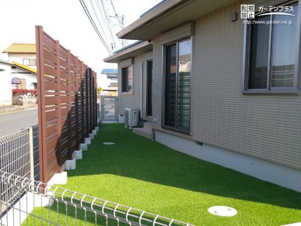 園路沿いに立派な植栽を植えられたお庭でしたが、お子様や愛犬のために整えたいとご依頼をいただき、植栽を撤去して人工芝を敷設しました。隣家沿いには境界フェンスを設置して、わんちゃんやお子様がボール遊びをしても安全です。