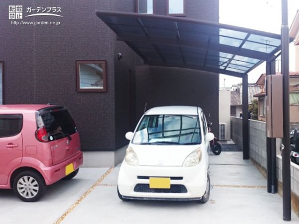 新築外構一式工事を承りました。駐車スペースには土間コンクリートを打設し、カーポートを設置。お住まいの外壁とも調和するダークカラーのカーポートが、便利なカーライフを実現します。