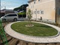 軽やかな樹形が魅力的なシンボルツリーを中心に、芝生を敷設し、化粧砂利の園路を周りに設置した、円形デザインの可愛いお庭が完成しました。園路周りのスペースでガーデニングを楽み、お好みの草花でお庭が華やかに彩るのが楽しみですね。