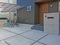 緩やかなスロープのあるアプローチに、使う人にやさしい手すりを設置し、美しいパネルをあしらった機能門柱を設置。プラチナステン色のアルミ商材でコーディネートした、スッキリとしたシンプルなデザインのセミクローズ外構が完成しました。