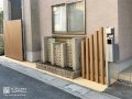樹木を伐採と撤去し、コンクリートを打設後、塗装材を塗りました。機能門柱の横に角柱を並べ、角柱の目隠しフェンスを設置しまし、縦のラインが美しい温かみのあるナチュラルテイストに仕上がりました。