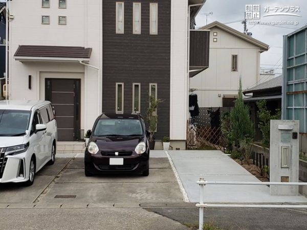 平板と砂利や芝生を敷かれていたアプローチを土間コンクリートで舗装し、お車が停められるようにリフォームしました。既存の門柱も邪魔にならない場所へ移動させ、ファサードスペースを広くご利用いただけます。